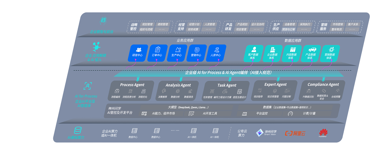端到端的一站式AI工作空间深度融合了从企业战略规划到日常经营的全流程业务板块,,定向解决车企内部领域多、、、部门多、、链条长、、场景碎片化等难题,,,支持车企快速构建以AI为核心的生产力写作体系,,实现任务执行与AI能力的无缝集成与交互